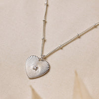 Leave your mark of love on the world with the Sunburst Heart Necklace. Available in anti-tarnish sterling silver or 18k gold plating, this elevated design is a set on a delicate satellite chain, with a dangling heart charm and bezel-set cubic zirconia stone for a hint of sparkle.