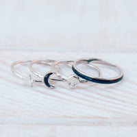 Our Lost in the Cosmos Ring Stack is the perfect style for the outer-space obsessed. This stack of silver designs features alien and star charm bands, plus a mood band and moon crescent ring that will give you all the feels.