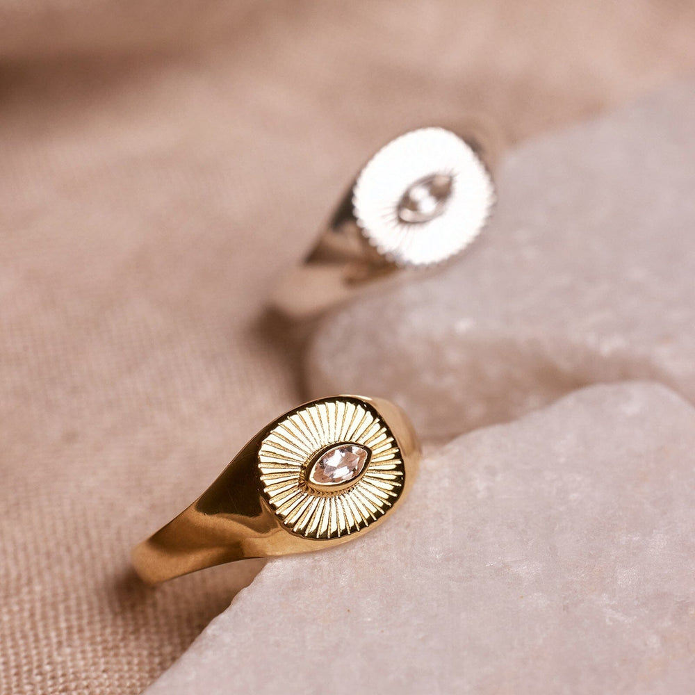 For the one who protected you most, our Protective Eye Ring is the perfect gift for a special mama in your life. Or treat yourself to some good vibes! Available in anti-tarnish sterling silver or 18k gold plating, this signet-inspired design features a protective eye that shines bright thanks to a bezel-set cubic zirconia stone.