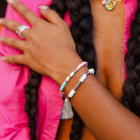 Our Tropical Breeze Stretch Bracelet groups solid pink and blue cylinders between puka shell and silver spacing beads. The bracelet measures about 6.25’’ unstretched and is strung on durable clear stretch nylon cord.