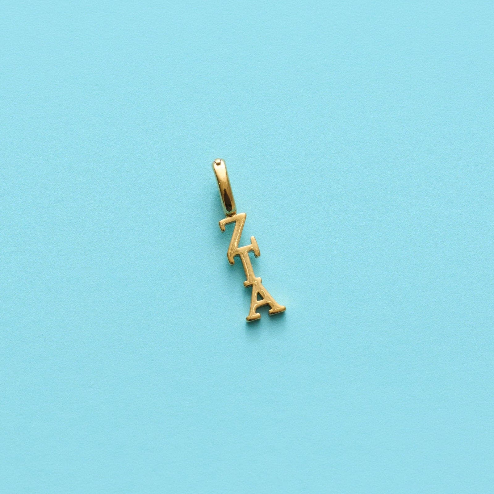 - Greek letter charm made with a stainless steel base and IP gold plating